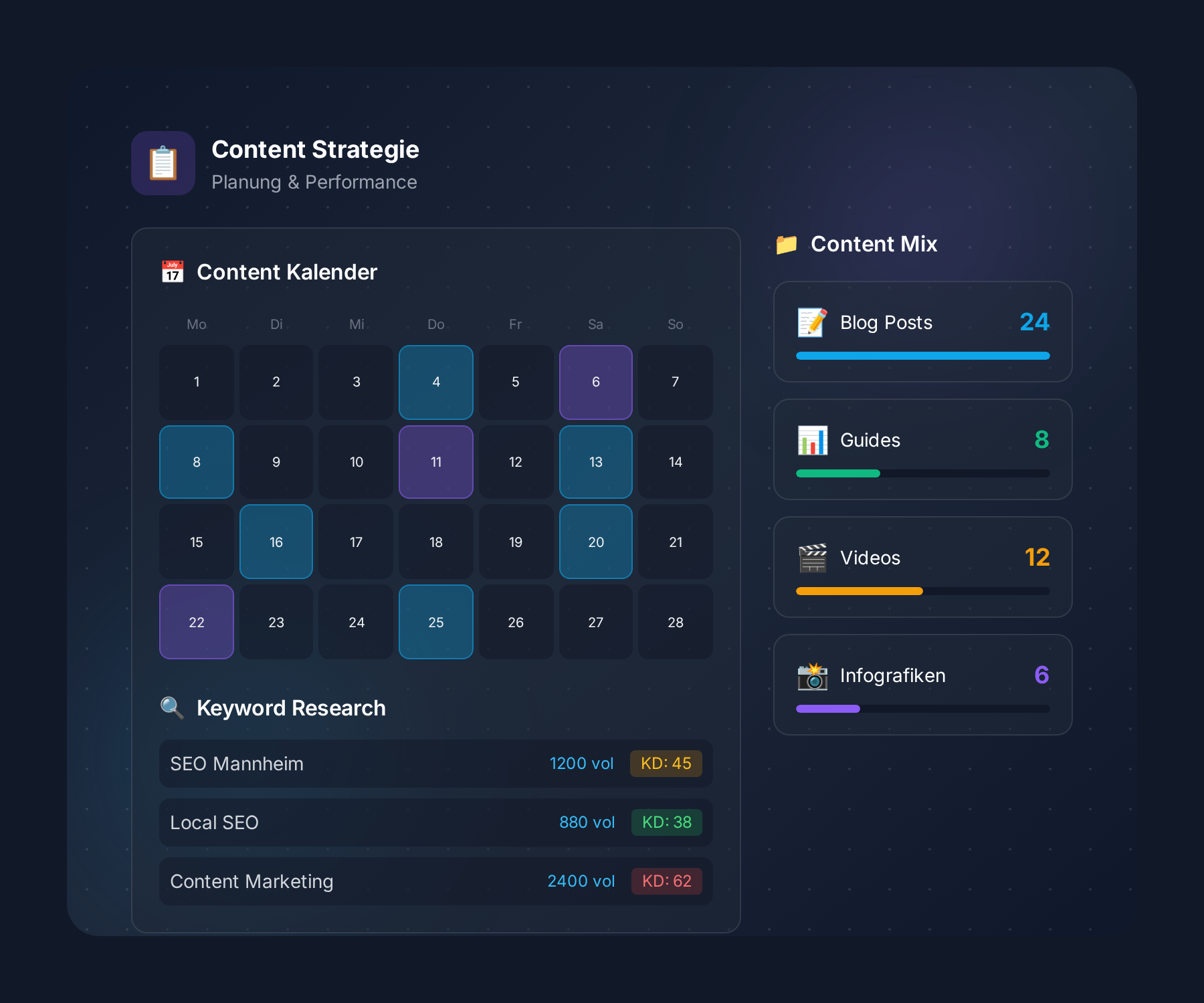 Ohne Strategie produzieren Sie Content ins Blaue. Eine datengetriebene Content-Strategie zeigt Ihnen genau, welche Themen Ihre Zielgruppe sucht, wie hoch die Ranking-Chancen sind und welcher Content den größten ROI bringt. Nach dem Helpful Content Update 2024 belohnt Google nur noch strategisch geplanten, hochwertigen Content.